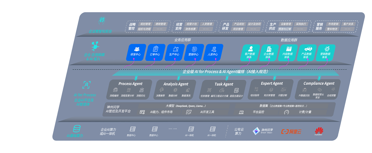 端到端的一站式AI工作空间深度融合了从企业战略规划到日常经营的全流程业务板块,,定向解决车企内部领域多、、、、部门多、、、链条长、、、场景碎片化等难题,,,,支持车企快速构建以AI为核心的生产力写作体系,,,实现任务执行与AI能力的无缝集成与交互